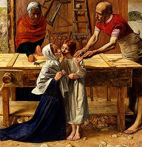 As God, He knew that the angelic apparition was prophetic of His future passion. Yet in His human nature as a small child, He is frightened and runs to His Mother for protection. Our Lady hastily picks Him up and clasps Him to her bosom. This action is indicated by the fact that the Lord’s right foot is nervously curled about the left ankle and in such haste that His right sandal has become loosened and hangs by a single strap. Further action is indicated by the way the Child Jesus clasps His Mother’s right hand with both of His, holding tightly to Our Lady’s thumb.
