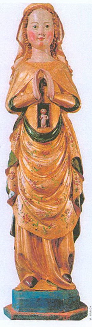 The historian found three sculptures of the Blessed Virgin Mary, each with an opening in the stomach,where the viewer could see a miniature carving of the unborn Christ Child. Such sculptures were highly valued devotional objects in the 14th and 15th centuries. In the 19th century, this type of devotional image no longer spoke to the souls of the sisters in the same way, so they hung a cloth over the stomach opening, or they nailed the opening closed. Since the covering for one of these Marian figures was missing, it was put away in a remote cell, where it stayed to the present time.