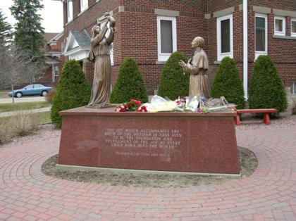 This is a statue of John Paul II kneeling before Mary, the Joyful Mother (Saint Peter Catholic Church Stevens Point, Wisconsin). An explanation of the significance of this statue is given below.