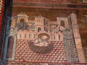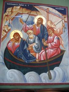 This is one of the paintings on the walls of the Greek Orthodox Church in Capernaum. Note that Jesus is depicted twice in the painting: once asleep and once calming the storm.