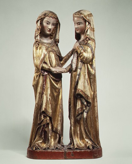 “Soon after the Virgin Mary learned of her miraculous conception of Jesus, she visited her kinswoman Elizabeth, who was also expecting a child, John the Baptist. This representation of their joyous meeting comes from the Dominican convent of Katharinenthal, in the Lake Constance region of present-day Switzerland. Carved of walnut, with the original paint and gilding almost completely preserved, the figures of Mary and Elizabeth are each inset with crystal-covered cavities through which images of their infants may originally have been seen. The representation of the Visitation incorporating images of the unborn Christ and John the Baptist is found with some frequency in late medieval works from German-speaking lands.”