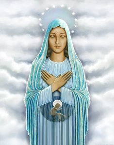 Nellie explains that soon after: ” I sensed I should paint an unborn child…I couldn’t think what sort of composition this would be, so I prayed for guidance. After about 2 weeks, I realized the unborn child would be Our Lord Jesus, in the womb of His Blessed Mother. I was afraid to attempt this but again, I could not get away from the idea. As with Kateri, I had no drawing to go by, nor visual aid…I simply started with the face of Mary and the composition seemed to develop almost organically. It was almost like watching someone else work.” The painting took nine months to complete.
