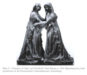 15th Century Visitation sculpture from Passau. As is customary in later representations of the Visitation, Mary and Elizabeth embrace, appearing as mirror images of one another, their unborn children, Christ and John the Baptist, can be seen in the mandoria-shaped hollows of their mother’s wombs. (see detail of Christ in the womb below)