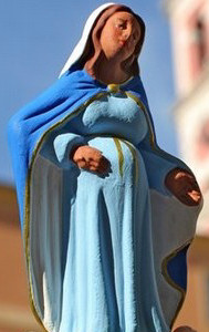 A ‘santon’ of a pregnant Virgin Mary, is seen in Nice, southern France, Friday, Dec. 22, 2006. Santons are traditional colored figurines usually set in Christmas Nativity scenes. This santon, designed by Christmas figurine maker, France‘s Dominique Coulomb of Aubagne, will be replaced by a post natal Virgin Mary at midnight on Dec. 24, Christmas Eve. (AP Photo/Lionel Cironneau)