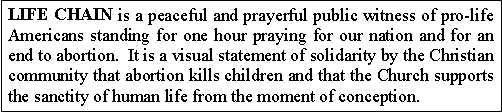 You will notice that on the New York Archdiocesan website they mention Life Chains around the state. This Sunday, October 5 there will be Life Chains all over the country. This is their 21st year:
