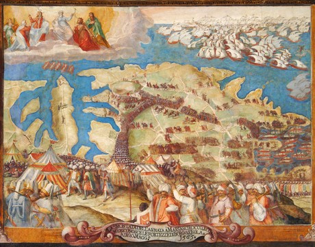 One of Matteo Perez d’Aleccio’s fresco’s depicting the Great Siege. The frescos started being painted eleven years after the siege and although Matteo Perez d’Aleccio himself was not a witness to the event he relied heavily on Francisco Balbi di Corregio’s account of the Great Siege and on surviving Knights, including the Grand Master who surely furnished the artist with more information. They are on display in the Palace of the Grand Master in Malta