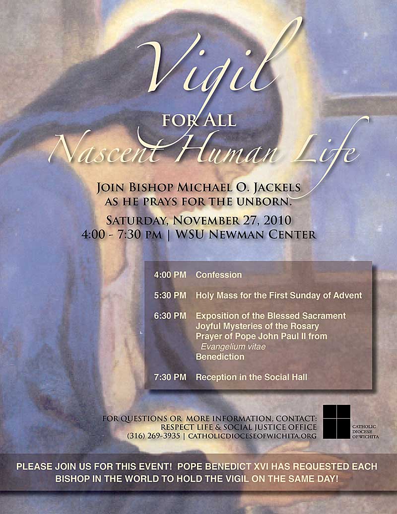 Archbishop Joseph F. Naumann will celebrate the vigil ceremony in Topeka, KS at Assumption Church (204 SW 8th Ave) at 7:00 pm on Saturday, Nov. 27th.