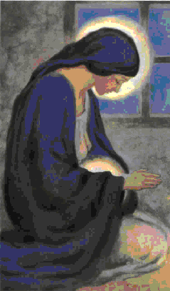 Some of Messiaen’s ‘gazes’ on the Infant Jesus include: Gaze of the Father, Gaze of the Star, The Exchange, Gaze of the Son upon the Son, By Him everything was made, The Kiss of the Infant Jesus, Glance of Silence (click here to see all of the pieces)…the piece that touches on our blog’s theme is: ‘Premiere Communion de la Vierge’. (No. 11, “Virgin’s First Communion”) and represents the Virgin on her knees, worshiping the unborn Jesus within her.