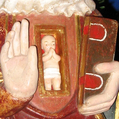 Below the statue (see above photos), in front of the basket appears an oval “O” iconographic detail of the Unborn Christ Child (reminiscent of the Advent “O” antiphons).