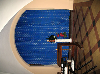 An antependium (Latin: “to hang before”), more commonly known as a hanging cloth, or, when speaking specifically of the hanging for the altar, an altar frontal (Latin: pallium altaris), is a decorative piece of material that can adorn a Christian altar, lectern, pulpit, or table. Specifically, an antependium hangs down in front of whatever it covers, and is to be distinguished from the altar linens which are used in the service of the Eucharist, and an altar cloth which covers the top of the altar.